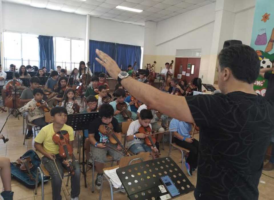 La presentación, estelarizada por escolares de entre 7 y 18 años, empezará justo al mediodía y tendrá una duración aproximada de 50 minutos. Según devela Cerda, se desarrollará bajo la modalidad “pirámide”, en la que los violinistas se irán incorporando progresivamente al escenario según el nivel de dificultad de los temas. “Comenzamos con las piezas más complejas, interpretadas por los alumnos con mayor experiencia, y a medida que avance el programa se van a ir sumando los más nuevos. De esta forma, todos participan en las últimas canciones, donde el conjunto se presenta de manera masiva”, detalla.