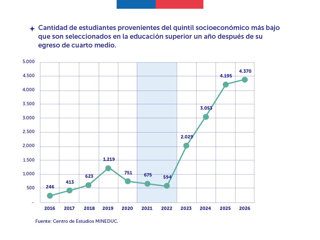 Uno de los principales resultados del estudio es el incremento sostenido de estudiantes seleccionados pertenecientes al quintil socioeconómico más bajo, que por cuarto año consecutivo incrementa. Tras la pandemia, un total de 594 estudiantes de este grupo fueron seleccionados en las universidades del Sistema de Acceso, cifra que subió a 2.029 en el año 2023. En 2024 fueron 3.053, en 2025 4.195, y en 2026 llegan a 4.370 estudiantes, lo que representa 1.300 seleccionados más que en 2024.