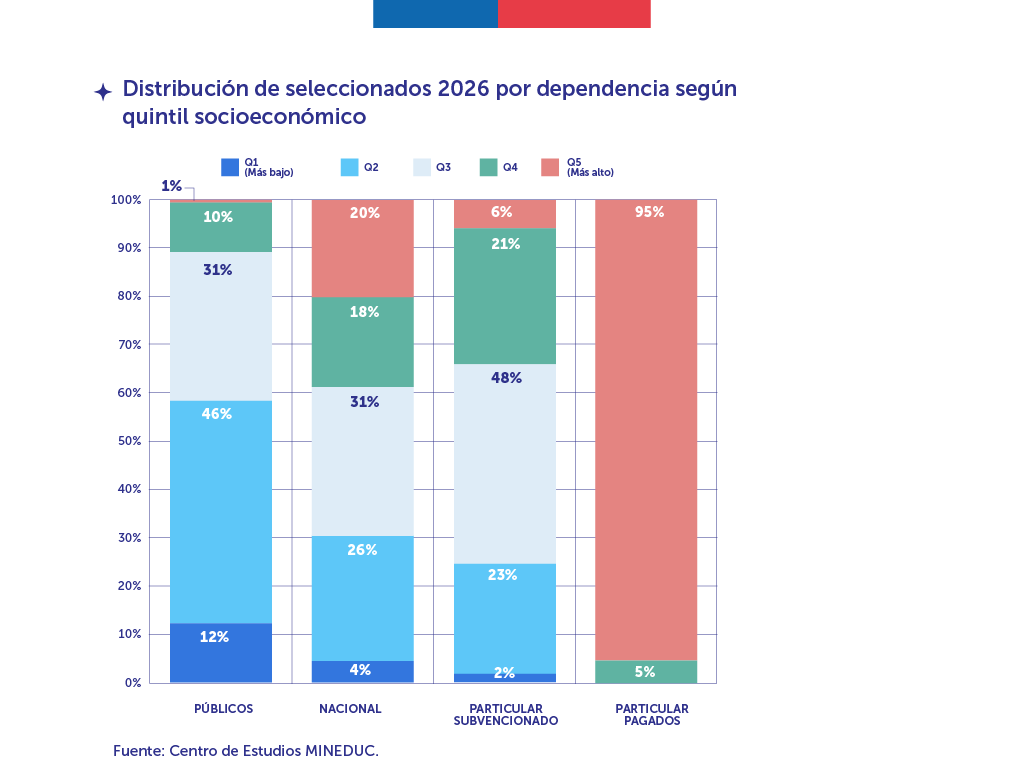 El análisis fue elaborado por el Centro de Estudios del Ministerio de Educación y observa los resultados de los procesos de selección a la educación superior para estudiantes que egresaron de cuarto medio el año anterior al proceso de admisión, considerando su distribución por quintil socioeconómico y tipo de establecimiento de origen.