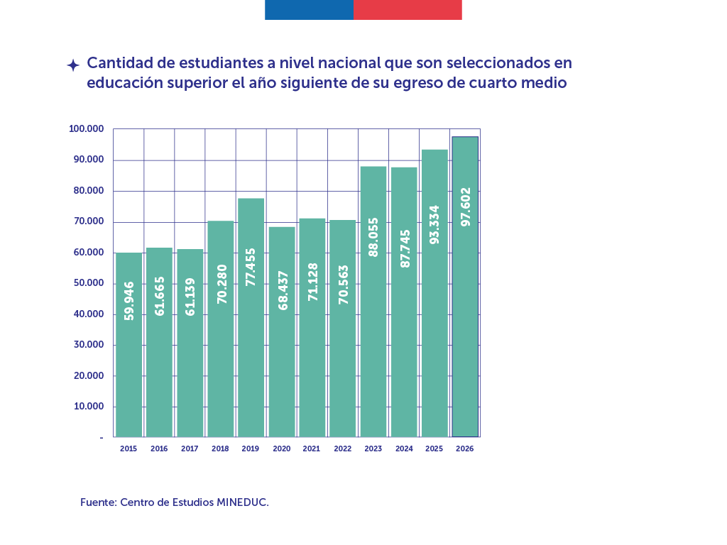 El análisis revela además que, a nivel general, la cantidad de estudiantes que postulan el año siguiente a su egreso de cuarto medio y que son seleccionados para ingresar a la educación superior aumenta por segundo año consecutivo, alcanzando en el proceso 2026 un total de 97.602 estudiantes, cerca de 27 mil más que en 2022.