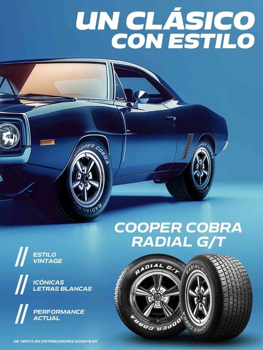 Fundada en 1914 y con más de un siglo de tradición, la marca estadounidense Cooper Tires busca ofrecer una calidad superior, excelente desempeño y una competitiva relación precio-calidad. Así nace el Cooper Cobra Radial G/T, neumático que se distingue por su diseño con letras blancas en el costado, una característica que evoca el espíritu de los muscle cars y vehículos icónicos de décadas pasadas, otorgando un sello de personalidad único.   Entre sus principales atributos destacan: