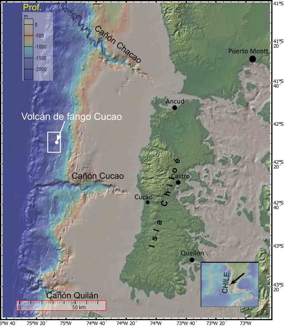 A unos 86 kilómetros al oeste de Chiloé y a 1.800 metros de profundidad, los científicos descubrieron una estructura circular con un gran cráter central, a la que denominaron Volcán de Lodo de Cucao. El hallazgo fue liderado por el académico Cristian Rodrigo, junto a Fernanda Ruiz, Nitza Garrido y Ximena Contardo, de la carrera de Geología UNAB, sede Viña del Mar.