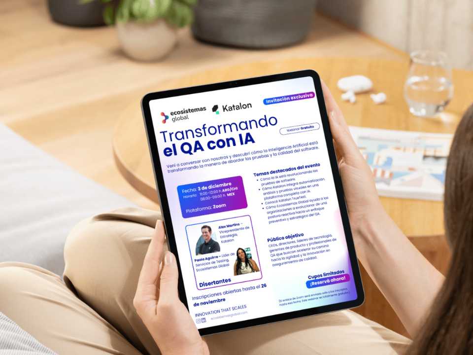 Ecosistemas Global y Katalon organizan para el próximo 3 de diciembre el webinar “Transformando el QA con IA”, un evento gratuito y exclusivo orientado a profesionales de tecnología que buscan acelerar sus estrategias de calidad mediante el uso de Inteligencia Artificial.